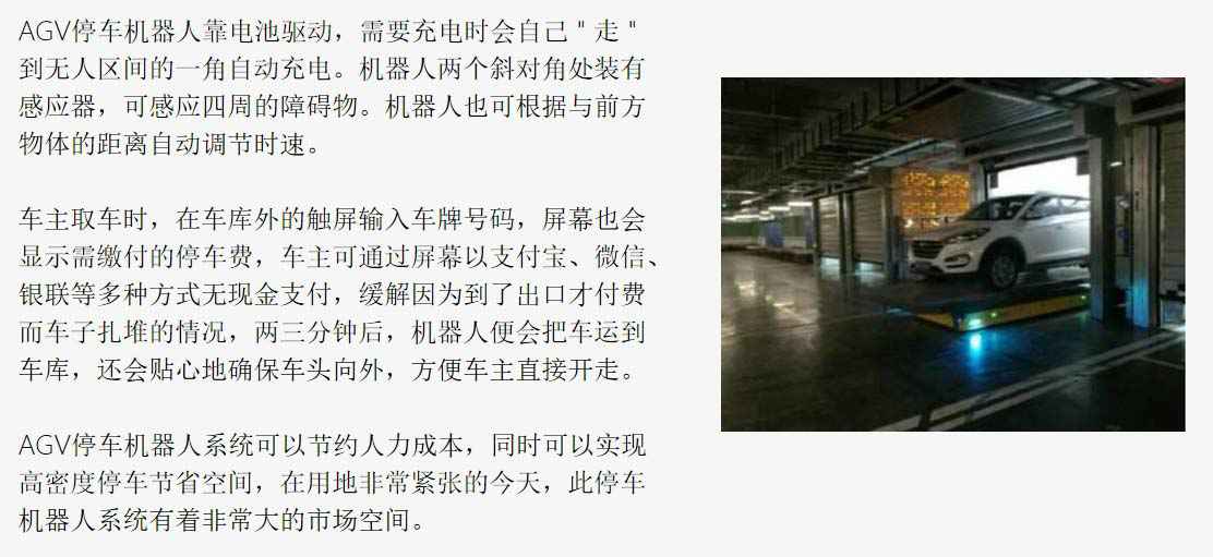 AGV 停车机器人系统,只要司机把车开进一个特殊的独立车库,将车辆平稳地开到中间车架上后,司机按提示锁车离开,随后会有停车机器人将车架整体搬运至后方车库,机器人系统可以自动完成入库、上下电梯、定位停放及出库等一系列动作。