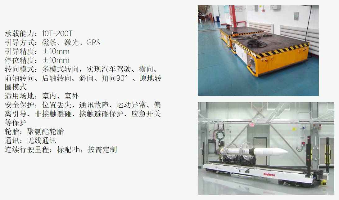 装载能力10T-200T,根据用户需求,引导车的动力和执行机构形式、车辆长度、宽度、提升高度、驱动能力、连续形式里程等均可按需设计。